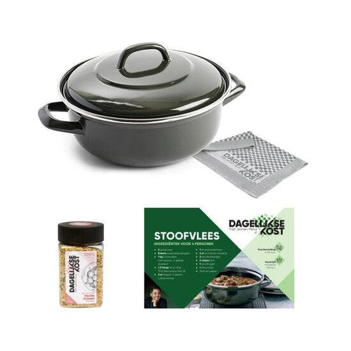 De Dagelijkse Kost Stoofvleesbox is niet zomaar een stoofpot. Naast de hoogwaardige RVS stoofpot bevat deze set ook een stijlvolle theedoek, een speciale kruidenmix voor stoofvlees en een authentiek recept om je te helpen een meesterlijk gerecht te bereiden.