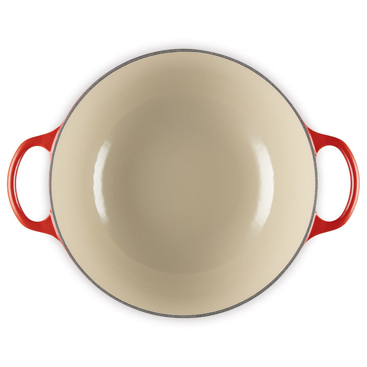 Deze pan combineert traditioneel vakmanschap met moderne technologie. Het gietijzeren materiaal zorgt voor een optimale warmteverdeling en houdt warmte langer vast, wat resulteert in heerlijk malse gerechten. De krasbestendige emaillaag maakt de pan extra duurzaam en eenvoudig te reinigen, terwijl de diepe Kersenrode kleur een tijdloze uitstraling geeft.