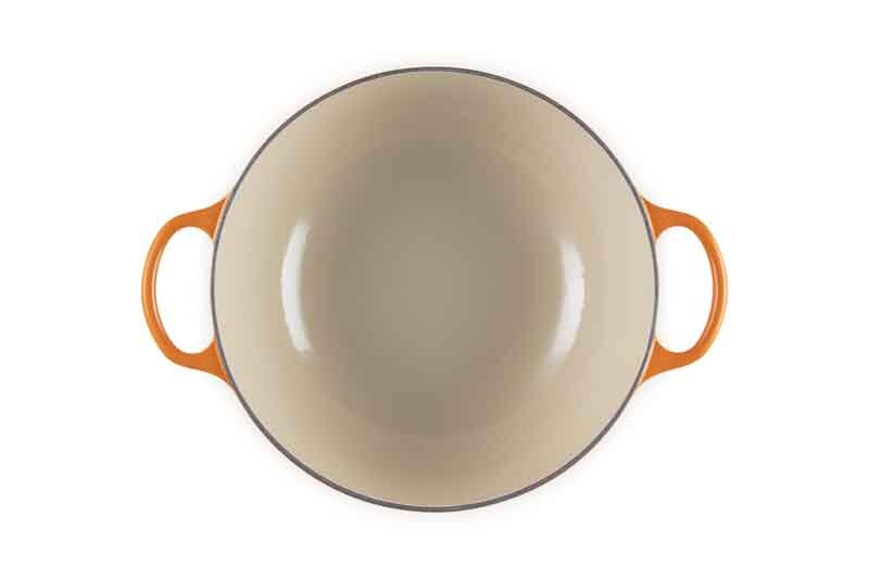 Deze pan combineert traditioneel vakmanschap met moderne technologie. Het gietijzeren materiaal zorgt voor een optimale warmteverdeling en houdt warmte langer vast, wat resulteert in heerlijk malse gerechten. De krasbestendige emaillaag maakt de pan extra duurzaam en eenvoudig te reinigen, terwijl de levendige Oranjerode kleur een stijlvolle uitstraling geeft.