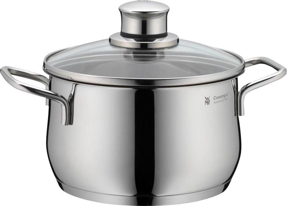 De WMF Diadem Plus Pannenset is een stijlvolle set dankzij de bolvormige vorm. Deze set bestaat uit 1 steelpan en 4 verschillende kookpannen. Hiermee kun je saus opwarmen in de steelpan en groenten en aardappelen koken in de andere pannen.