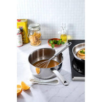 Deze koekenpan is gemaakt van hoogwaardig roestvrij staal, wat zorgt voor uitstekende warmtegeleiding en -behoud. Dit betekent dat je gerechten gelijkmatig kunt bereiden en ze warm kunt houden tot ze geserveerd worden.