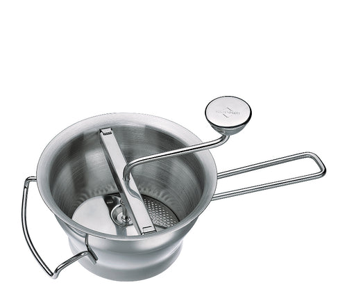 De groentenmolen 'passe-vite' is een veelzijdige klassieker die ook in de hedendaagse keuken onmisbaar geworden is. Met deze roerzeef is het mogelijk grote hoeveelheden fruit, groenten en aardappelen in een handomzwaai om te toveren tot gelei, sauzen, soepen en puree.Pureren en malen van fruit en groenten terwijl het vel, de zaadjes en vezels apart gescheiden worden. Deze passe-vite is gemaakt van 18/10 inox en zijn bijgevolg vaatwasbestendig en makkelijk in onderhoud.