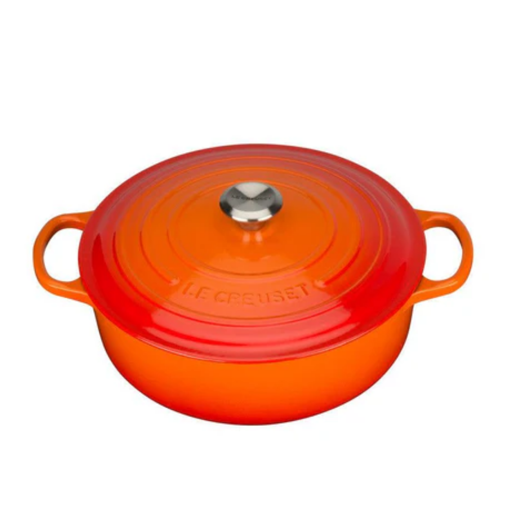De Le Creuset gietijzeren lage braadpan in Oranjerood, met een diameter van 30 cm en een capaciteit van 6,2 liter, is ideaal voor het bereiden van stoofschotels en braadgerechten. Deze braadpan combineert functionaliteit met de iconische Oranjerode kleur van Le Creuset, geïnspireerd door gesmolten gietijzer.