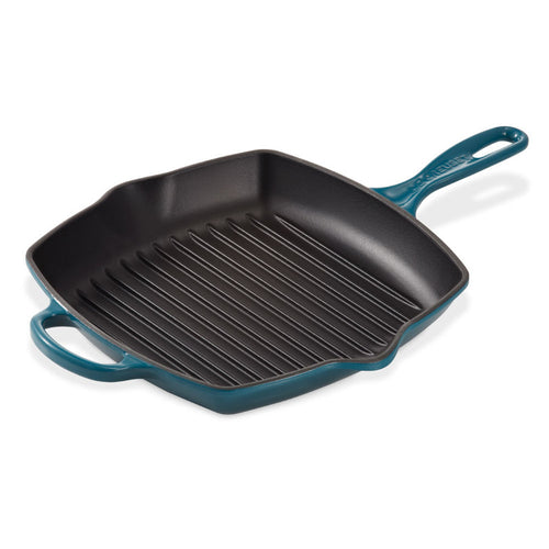 Bereid heerlijke gegrilde gerechten met gemak en stijl met de Le Creuset gietijzeren vierkante grillpan van 26 cm in Deep Teal.