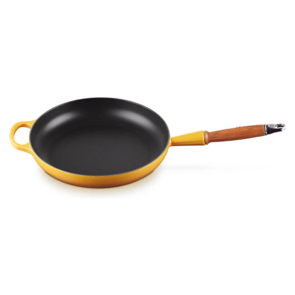 De Le Creuset Signature koekenpan met houten handvat in Nectar, met een diameter van 28 cm en een inhoud van 2,6 liter, combineert de functionaliteit van gietijzer met de elegantie van een houten handvat. Deze pan is ideaal voor het bereiden van een breed scala aan gerechten.