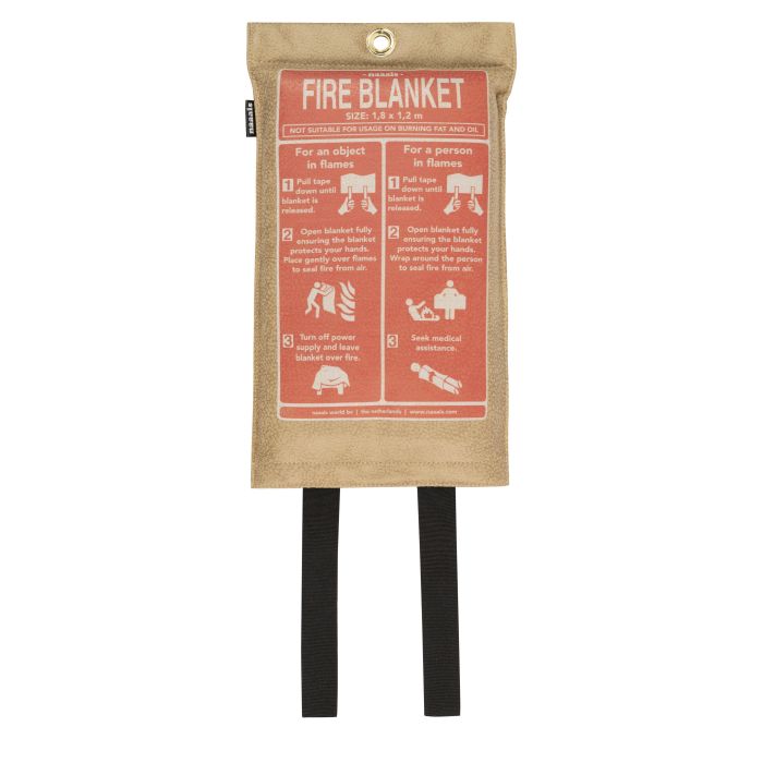 Met deze goedgekeurde duurzame blusdeken van naaais blus je eenvoudig beginnende en kleine branden in en om je huis. Door de trendy verpakking past deze blusdeken goed in het interieur van iedere keuken, zitkamer, kinderkamer, boot, caravan, camper, etc. Door het grote formaat van 1,20m bij 1,80m kan de blusdeken ook gebruikt worden voor personen en om brandende omgevingen te ontvluchten. Deze eye-catcher is uitgevoerd met een handig ophangoog en voldoet aan de geldende BS-EN 1869:2019 norm. Op de achterkant staat zowel in schrift als in beeld hoe de deken gebruikt moet worden.