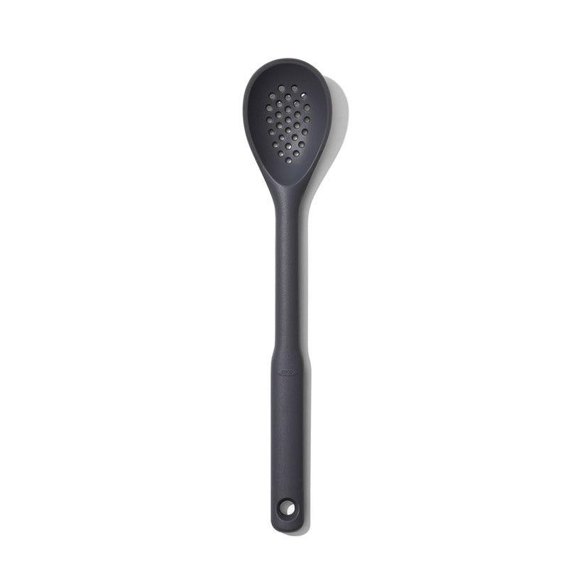 De grijze siliconen OXO Lepel met gaatjes is handig voor het scheppen en roeren van groenten, pasta en meer. Overtollig water druipt weg door de gaatjes. Het siliconen is hittebestendig, voedselveilig en bestaat uit één stuk. Hierdoor is deze soeplepel duurzaam en gemakkelijk te reinigen.
