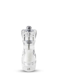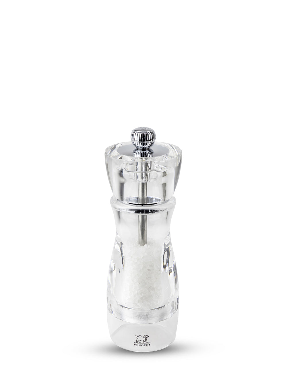 De transparante body uit acryl van de manuele zoutmolen Vittel 16 cm draagt een schitterende ring uit metaal die zijn grootte op een elegante manier onderstreept. De schitterende knop op de zoutmolen VIttel voegt een bijzondere charme toe aan zijn silhouet. Deze knop vergemakkelijkt het gebruik, omdat u hiermee de maalgraad naar uw wens kunt aanpassen: draai sterker aan om een fijnere maalgraad te bekomen. Het Peugeot maalgraad die in deze transparante molen voorzien is, heeft een onbeperkte garantie.